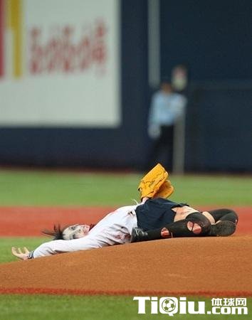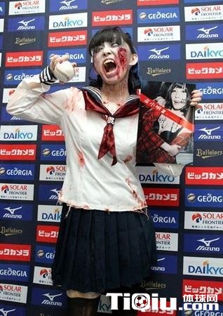 开球仪式结束后,“小明”马上倒在地上,握着麦克风用可怕的声音宣传起鬼屋的后续活动,她说自己将制作2万个饭团等待大家光临。“小明”画着僵尸妆,身着中学生制服,浑身是“血”,从一垒的长椅旁登场。她拖着右腿缓缓行走,并模仿运动员高抬腿,奉献了一记精彩的开球。球弹了3次以后进入击球区,直击欧力士队的 吉祥物“欧力士野牛”,令全场球迷倒吸了一口凉气。