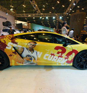 中国最壕勇士库里球迷 兰博基尼跑车库里半身像