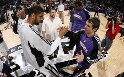 圣安东尼奥马刺队,于1976年成立,是美国男篮职业联赛(NBA)西部联盟西南赛区的一部分。马刺总共获得5座总冠军奖杯。马刺于1982年和1983年两次闯入西部决赛,但两次都败给了由“魔术师”约翰逊领衔的洛杉矶湖人队。直到进入90年代,由于两位状元秀大卫·罗宾逊和蒂姆·邓肯的先后加盟,“双塔战术”为球队带来了1999年和2003年NBA总冠军。2005年、2007年与2014年均获一座总冠军奖杯。