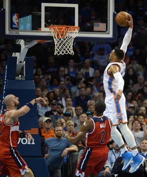 北京时间12月1日消息,雷霆vs奇才NBA常规赛。此役中奇才双枪与威少展开较量,沃尔拿下15分15助攻6篮板,比尔暴砍31分5篮板双枪数据相当完美,而雷霆威少全场入账35分14篮板11助攻,在奥拉迪波25分的爆发下最终在加时赛中以125-115击败奇才。...