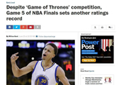 北京时间6月17日消息 《华盛顿邮报》消息,与前面四场总决赛一样,总决赛第五战再次刷新了NBA总决赛在ABC电台的收视纪录。...