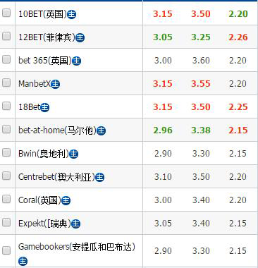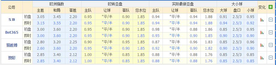 澳彩公司由原来半球中水退至平半超低水有妥协的意思,欧洲指数方面,易胜博平赔仅开出3.20偏低位置,而伟德公司负赔由原来的5.00大幅下调至3.90对主队是不利消息,本轮主场取胜会有一定的难度。