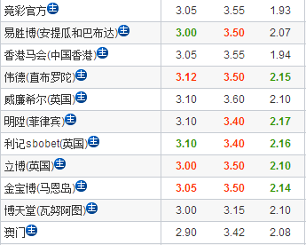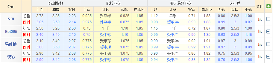 澳彩公司由原来半球中水退至平半超低水有妥协的意思,欧洲指数方面,易胜博平赔仅开出3.20偏低位置,而伟德公司负赔由原来的5.00大幅下调至3.90对主队是不利消息,本轮主场取胜会有一定的难度。