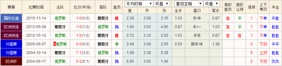 从盘口来分析,东道主俄罗斯在占据天时地利人和的局面上却无法在主场做出让步,可以证明机构对俄罗斯信心不足,反而对葡萄牙的实力给予较高的肯定和一致的认可。而在相同历史亚赔的五场比赛中,葡萄牙赢下的其中的四场,当前盘势相当强硬,上盘拉力十足。而欧赔主流公司方面也稍稍抬高负赔,并进一步下调平赔,盘赔有意调整打压上盘筹码的介入信心意图,以分流客胜的热度;综合来看,本场比赛葡萄牙有望反客为主,客场阻击东道主俄罗斯。