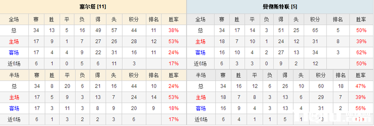 曼联在欧战历史上47次对阵西班牙球队,取得12胜19平16负的战绩,其中客场战绩为2胜10平10负。塞尔塔9次对阵英格兰球队战绩为5胜4负,其中主场战绩为2胜2负。